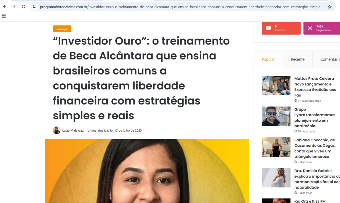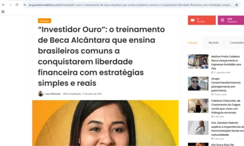 O treinamento Investidor Ouro foi destaque na matéria do portal Hora da Fama como “o método que ensina brasileiros comuns a conquistarem liberdade financeira com estratégias simples e reais.”